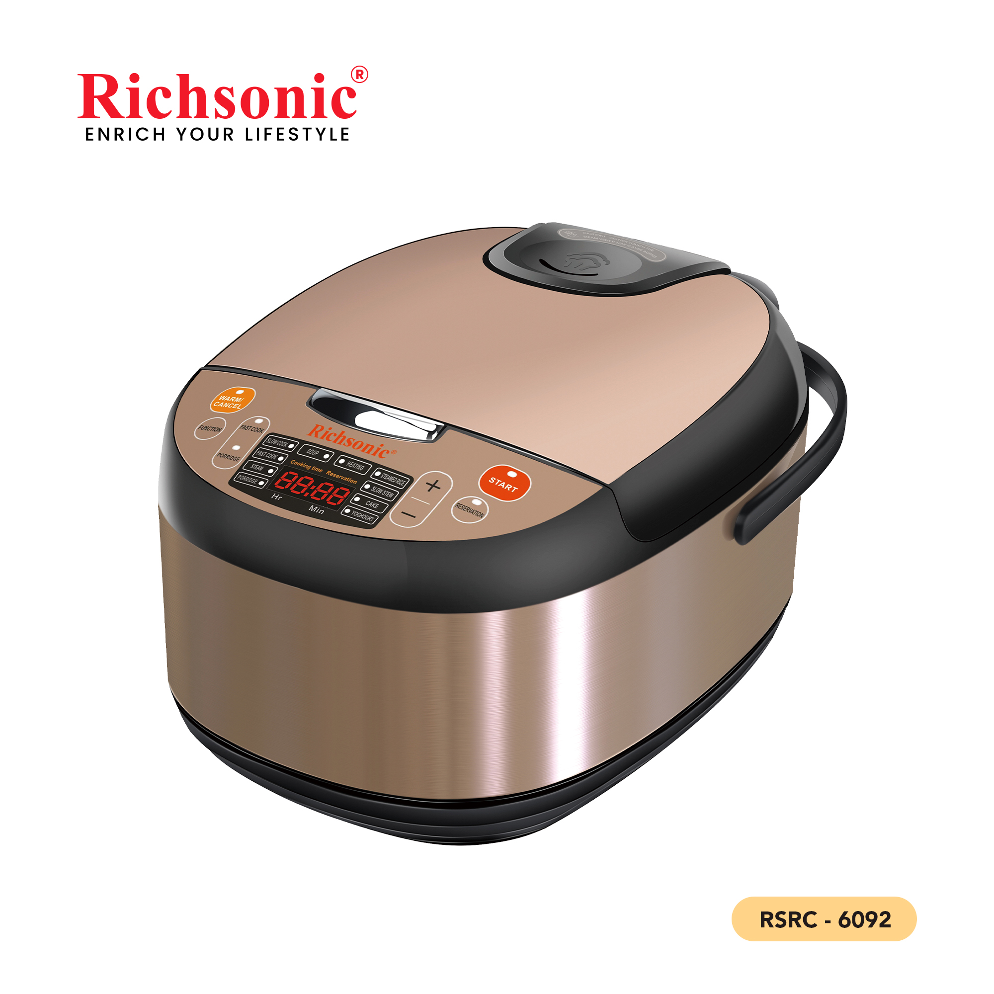 The RSRC-6092 brings the perfect balance of capacity and versatility. With a 5.0L container, this multi cooker simplifies meal preparation, handling everything from rice to slow-cooked dishes effortlessly.